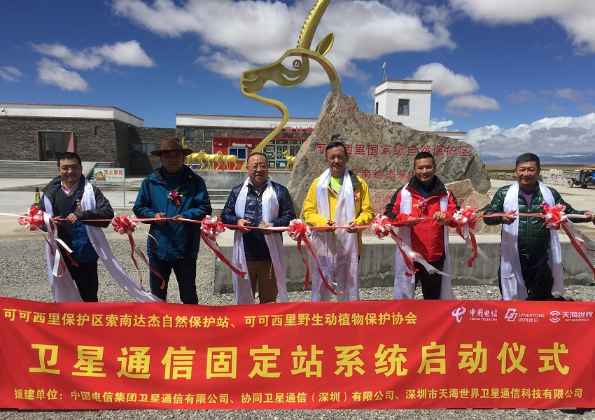 8月29日下午,在可可西里保護區索南達杰自然保護站舉行了一場簡單而有意義的啟動剪彩儀式,由中國電信集團衛星通信有限公司、深圳天海世界衛星通信科技有限公司以及協同衛星通信(深圳)有限公司聯合捐贈和援建的衛星通信固定站正式啟用。參加剪彩儀式的有可可西里野生動植物保護協會陳子洵會長、可可西里國家級自然保護區管理局代表及參與捐贈和援建的公益愛心企業領導。