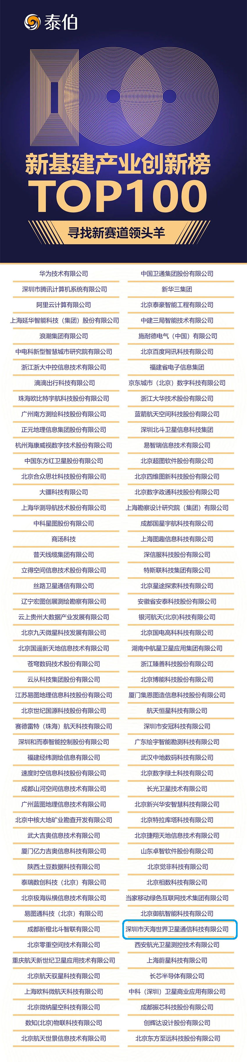 8月18日,WGDC2020全球地理信息開發者大會開幕,在開幕式與領袖峰會上,泰伯網重磅發布了“新基建產業創新榜TOP100”。來自衛星互聯網、新型智慧城市、自然資源信息化三大領域的100家企業獲此殊榮,天海世界衛星通信榮登榜單。